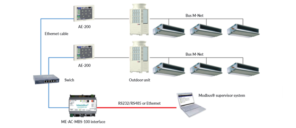 • Mitsubishi Electric предлага интерфейс, който може да контролира до 100 вътрешни тела (ME-AC-MBS-100) за управление на VRF CITY MULTI инсталация с BMS система.